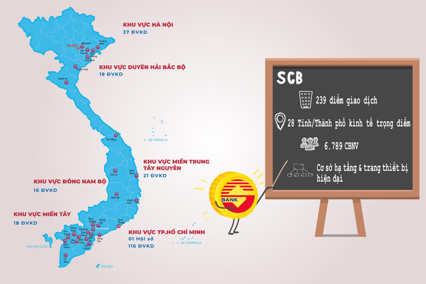 SCB hiện có 239 điểm giao dịch được phân bổ rộng khắp trên 28 Tỉnh/Thành phố thuộc các vùng kinh tế trọng điểm.